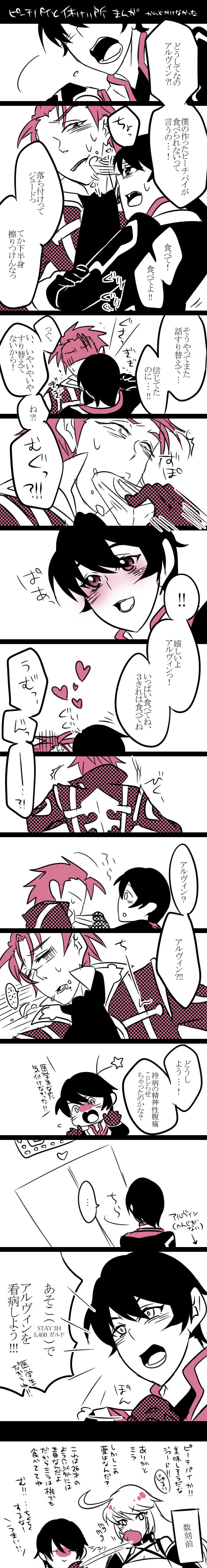 相方の音を脅してアルヴィンちゃんにピーチパイ食べさせるジュードくん描かせたらすごく興奮してしまって、勢いに任せて勝手に続き漫画描きました。